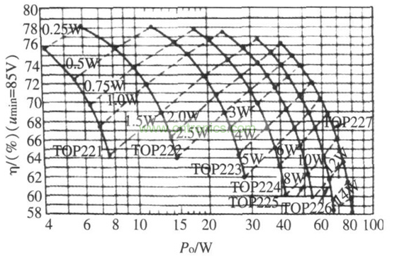 在設(shè)計(jì)開關(guān)電源時(shí),首先就要面臨如何選擇合適的開關(guān)電源控制芯片。在選擇芯片的時(shí)候,要既能滿足要求,又不因?yàn)檫x型造成資源的浪費(fèi)。下面就介紹利用TopswitchⅡ系列開關(guān)電源的功率損耗( PD ) 與電源效率(η),輸出功率( Po ) 關(guān)系曲線,快速選擇芯片的型號,從而完成寬范圍輸入的通用開關(guān)電源的設(shè)計(jì)。