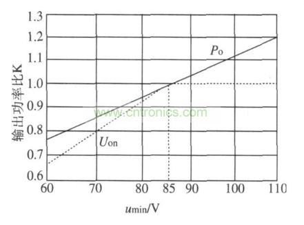 PD ,η, Po 關(guān)系曲線均對交流輸入電壓的最小值進(jìn)行了限制,umin = 85 V.如果交流輸入電壓最小值不符合上述的要求,就會(huì)直接影響芯片的正確選擇。此時(shí)必須從實(shí)際的交流輸入電壓u? min最小值對應(yīng)的功率P''o 折算成umin為規(guī)定值時(shí)的等效功率Po,才能使用上面的圖。功率修正的方法如下: 選擇使用的特性曲線,然后根據(jù)已知的u''min值查出折算系數(shù)K;將P ''o折算成umin為規(guī)定值時(shí)的等效功率Po,表達(dá)公式P o=P''o / K;然后從圖3、圖4 中選用適當(dāng)?shù)年P(guān)系曲線。