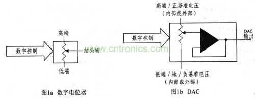 利用數(shù)字輸入控制微調模擬輸出有兩種選擇:數(shù)字電位器和數(shù)/模轉換器(DAC),兩者均采用數(shù)字輸入控制模擬輸出。通過數(shù)字電位器可以調整模擬電壓;通過DAC既可以調整電流,也可以調整電壓。電位器有三個模擬連接端:高端、抽頭端(或模擬輸出)和低端(見圖1a)。DAC具有隊應的三個端點:高端對應于正基準電壓,抽頭端對應于DAC輸出,低端則可能對應于接地端或負基準電壓端(見圖1b)。