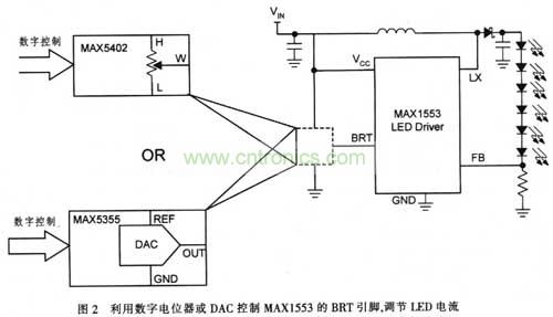 但在當前的許多應用中,DAC與數(shù)字電位器之間選擇的界限比較模糊,圖2中的DAC和數(shù)字電位器都可用于控制MAXl553 LED驅動器。MAXll53亮度(BRT)輸入的直流電壓和檢流電阻決定了LED的電流。