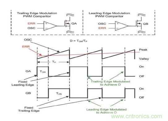 后沿脈寬調(diào)制比較器通過對比鋸齒電壓波形(OSC)和誤差電壓(ERR)來控制功率轉(zhuǎn)換器占空比(D)。一般,誤差電壓由一個反饋運算放大器控制。在后沿脈寬調(diào)制中,OSC引腳被饋送給脈寬調(diào)制比較器的負(fù)輸入,而誤差電壓則饋送至脈寬調(diào)制比較器的非反相輸入。脈寬調(diào)制比較器的輸出用于控制功率轉(zhuǎn)換器(QA)的FET柵極。該柵極驅(qū)動導(dǎo)通信號與OSC信號波谷同步。在這種配置結(jié)構(gòu)中,F(xiàn)ET柵極驅(qū)動的后沿經(jīng)過調(diào)制,以達(dá)到功率轉(zhuǎn)換器占空比 (D)。該后沿為FET關(guān)斷時(請參見圖 1)。