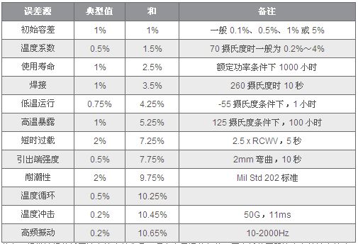 有趣的是,這樣給低壓輸出帶來了更高的精度。許多IC參考電壓范圍為0.6~1.25 V之間,輸出電壓降至這一范圍時會帶來1%或更高的精度。表1給出了您可能需要了解的一些信息,這些信息是典型電阻器產(chǎn)品說明書的電阻誤差術(shù)語匯編。在設(shè)計中,該列表會較難理解。大多數(shù)工程師都止步于初始容差,然而列表中還有一些或許不應被忽略的誤差項。表格中的每一項都有其微妙的影響。例如,沒有指定具體的溫度系數(shù)范圍,而實際上兩個電阻都可能隨溫度變化以相同方向變化,并且不會在相反的極端。在對一些經(jīng)驗豐富的設(shè)計工程師進行簡單調(diào)查后,得出的結(jié)論是假設(shè)1%容差電阻的2.5%精度可在極端情況和合理成本之間得到一個合理的折中方案。