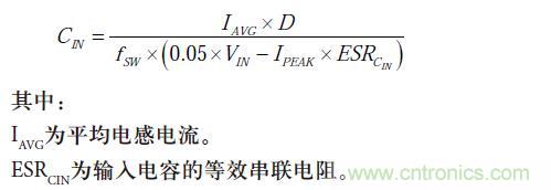 注意,輸入電流在反相降壓/升壓拓撲結(jié)構(gòu)中也是非連續(xù)的。假設在接通時輸入電容的能量損耗所引起的輸入電壓偏差小于輸入電壓的5%,則通過下式可計算滿足此要求的最小輸入電容。