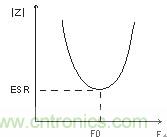 由上式可知,電容器的阻抗不僅與電容量有關(guān),同時還與等效串聯(lián)電阻、雜散電感、系統(tǒng)頻率有關(guān)。其阻抗|Z|與頻率的關(guān)系曲線見圖2所示