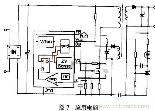 由(9),(10)或可知,調節(jié)輸出功率、穩(wěn)定輸出電壓可以調節(jié)導通時間或占空比或調頻方式或幾種方式綜合應用。當輸出功率下降或電源電壓上升,導通時間減小,反之導通時間增加;隨輸出功率的增加或減小變壓器初次級電流峰值均增加或減小,由式(3)可知變壓器的釋放儲能時間也隨之增加或減少,為實現(xiàn)“零電壓”開關,變壓器不能工作在間歇狀態(tài),因此F%IM控制方式不能滿足本文電路的“零電壓”開通的要求?;谏鲜龉ぷ鳁l件的約束,本文電路應采用輸出電壓反饋控制導通時間,用“零電壓”檢測控制開關管導通時刻,即調頻、調占空比工作方式。具體電路可以采用通用器件組合,如圖7。