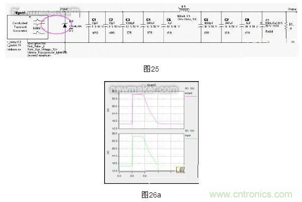 2) 脈沖2a 模擬由于線束電感的原因,使與DUT并聯(lián)的裝置內(nèi)電流突然中斷引起的瞬態(tài)現(xiàn)象;脈沖2b 模擬直流電機(jī)充當(dāng)發(fā)電機(jī),在點(diǎn)火開關(guān)斷開時的瞬態(tài)現(xiàn)象。仿真結(jié)果見圖15a。