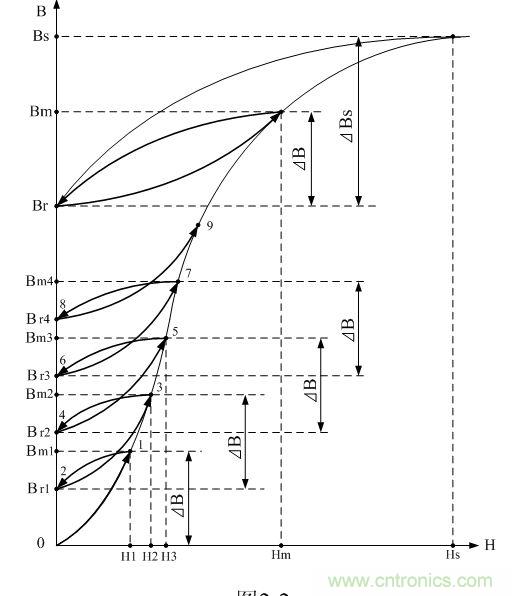 (2-9)式中,ΔB為磁感應強度增量。由于輸入脈沖的幅度U和寬度τ分別與磁感應強度增量ΔB和磁場強度增量ΔH的大小相對應,只要作用于開關變壓器線圈上的脈沖電壓的幅度U和脈沖寬度τ不變,則流過變壓器次級線圈回路中的電流也不變,這只是在導磁率為常數(shù)的情況下;但由于導磁率不是一個常數(shù),即變壓器鐵芯磁化曲線的非線性,致使經(jīng)過若干個脈沖序列之后,開關變壓器鐵芯中的最大磁感應強度 和剩磁 就會相對穩(wěn)定在某個值上。此時剩磁 對應每個輸入直流脈沖的起點(0電壓),而最大磁感應強度 對應每個直流脈沖的終點(電壓最大值)。