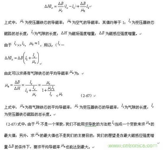 最大值的條件;當(dāng)然是氣隙長(zhǎng)度越小,平均導(dǎo)磁率 就越大。但在實(shí)際工作中, 的值要小于此值,因?yàn)?,?duì)氣隙長(zhǎng)度要預(yù)留一定的余量,變壓器鐵芯的工作點(diǎn)不可能讓永遠(yuǎn)工作在最佳值的邊沿;因此,實(shí)際工作中的變壓器鐵芯,其最大磁感應(yīng)強(qiáng)度增量和最大磁場(chǎng)強(qiáng)度增量都會(huì)超出(2-68)式給出條件的范圍;所以,由(2-68)式求出的氣隙長(zhǎng)度 也是最低極限值。