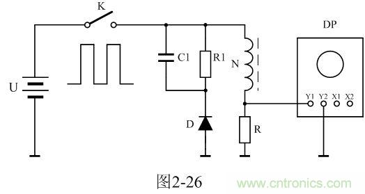 圖2-26中,U是電源電壓,通過控制開關(guān)K不斷地接通和關(guān)斷,就可以把電源電壓調(diào)制成單極性電壓脈沖;N為變壓器初級線圈,D為反激輸出整流二極管;R1為反激輸出負載電阻;C1為濾波電容;R為取樣電阻,通過測量R兩端的電壓,就可以知道流過變壓器初級線圈的電流;取樣電壓被送到示波器DP進行顯示。