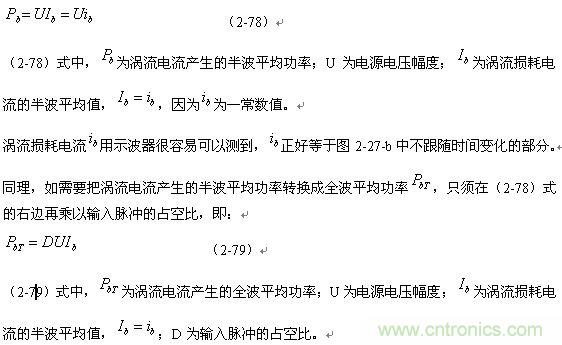 順便指出:(2-79)式的結(jié)果,是認為渦流損耗在t1-t2期間(圖2-27-b)完全等于0而求得的,但實際上,在t1-t2期間變壓器初級線圈產(chǎn)生的反電動勢同樣也會在變壓器鐵芯中感應(yīng)產(chǎn)生渦流損耗電流,即當輸入電壓為0時刻,在變壓器鐵芯中還存在很短暫時間的渦流損耗;由于這種渦流損耗是由反電動勢提供能量來維持的,它將隨著反電動勢能量的衰減很快就衰減到0。