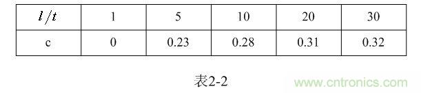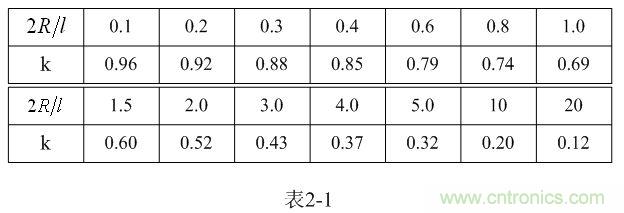 【說明】上式是用來計(jì)算多層線圈繞組、截面為圓形的空心線圈的電感計(jì)算公式。長(zhǎng)岡系數(shù)k可查閱表2-1,系數(shù)c可查閱表2-2。當(dāng)線圈內(nèi)部有鐵芯時(shí),有鐵芯線圈的電感是空心線圈電感的