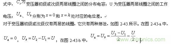 對(duì)于圖2-43-a,可求得變壓器初級(jí)或次級(jí)兩層線圈之間的分布電容為: