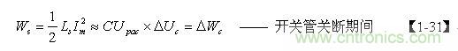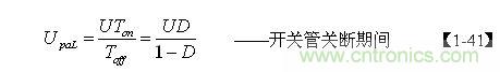 【1-41】式中,U為電源輸入電壓,Ton為電源開關(guān)管的導(dǎo)通時(shí)間,Toff為電源開關(guān)管的關(guān)斷時(shí)間,D為占空比。而Upau可根據(jù)漏感Ls 與開關(guān)變壓器初級(jí)線圈的電感L的比值k求得。