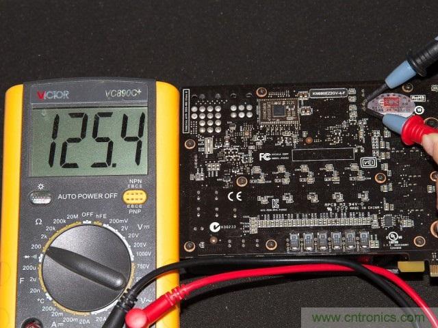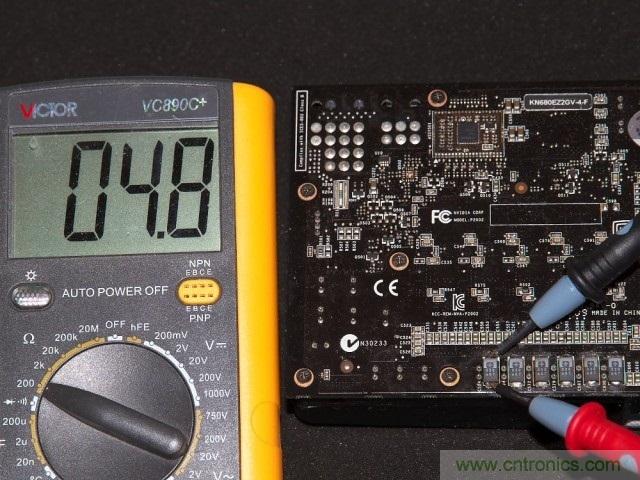 焊接完成后一是要用放大鏡配合電路圖仔細(xì)的測(cè)量各個(gè)元器件之間的連接關(guān)系,確定有無(wú)短路和虛焊。另外一個(gè)簡(jiǎn)單的辦法就是通過(guò)直接測(cè)量供電回路的電阻值(關(guān)機(jī)狀態(tài)下)來(lái)確定是否有明顯的焊接失誤。通常來(lái)說(shuō)GPU核心供電回路的電阻值在1歐姆到10幾歐姆之間,而顯存供電回路則是100-140歐姆左右。至于測(cè)量點(diǎn),選擇核心和顯存供電模塊輸出電容的兩個(gè)引腳就可以了??梢钥吹礁脑烨昂蠛诵?、顯存供電回路的電阻值都在4.8歐/125歐左右,因此焊接是沒(méi)有問(wèn)題的。