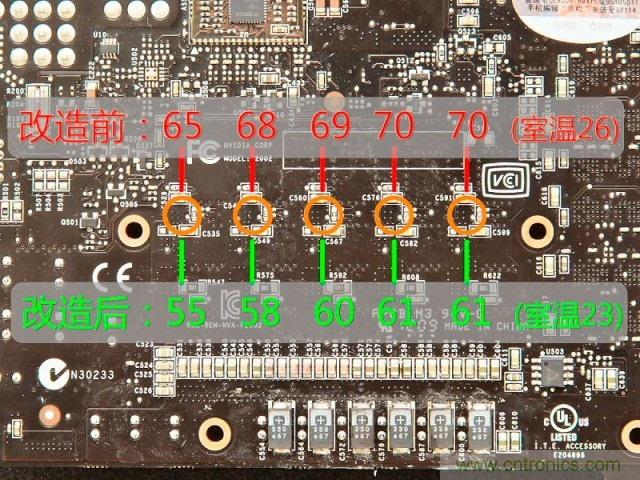 看下改造前后的供電模塊溫度吧,使用紅外測(cè)溫槍對(duì)準(zhǔn)供PCB背面供電模塊的位置分別取5個(gè)測(cè)量點(diǎn),測(cè)試使用FC2的benchmark tool連續(xù)運(yùn)行25分鐘后進(jìn)行溫度采集。沒(méi)有空調(diào),室溫不固定,沒(méi)有辦法,不過(guò)還是能看出改造后供電模塊的溫度的確有明顯的下降,刨去室溫的差距后應(yīng)該還能有5度以上的溫差。另外溫度的下降在另一個(gè)方面說(shuō)明供電模塊的效率提升,只是忙著改造忘記在之前測(cè)一下功率了,個(gè)人感覺(jué)應(yīng)該能省5瓦左右的功率吧。