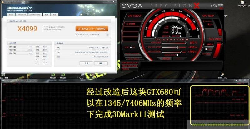 同時(shí),改造以后在原裝散熱器條件下,可以以1345MHz的核心頻率完成3D Mark11測(cè)試,取得x4099的高分。而在改造之前雖然也能用1345MHz跑完測(cè)試,不過(guò)跑的不是特別順利,得跑幾次才能過(guò)一次。這應(yīng)該是通過(guò)改造降低了供電紋波電流的功勞,可惜手邊沒(méi)有示波器,要不就能量化一下改造的效果了。
