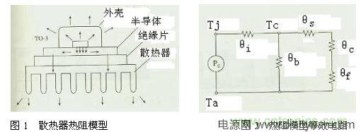 散熱器是開(kāi)關(guān)電源的重要部件,它的散熱效率高與低關(guān)系到開(kāi)關(guān)電源的工作性能,散熱器通常采用銅或鋁,雖然銅的熱導(dǎo)率比鋁高2倍但其價(jià)格比鋁高得多,故目前采用鋁材料的情況較為普遍,通常來(lái)講散熱器的表面積越大散熱效果越好,散熱器的熱阻模型及等效電路如圖1所示。