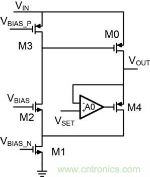 圖3:M4位于放大器反饋環(huán)路中、無(wú)輸出電容器的LDO。