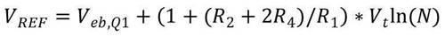通過(guò)添加雙極性晶體管的負(fù)溫度系數(shù)基射極間電壓,可獲得帶隙電壓的低溫系數(shù),從而可通過(guò)在不同電流密度下偏置的兩個(gè)基射極間電壓之差獲得正溫度系數(shù)電壓。為電阻器R2和R3選擇相等的值,參考電壓就可表示為公式5: