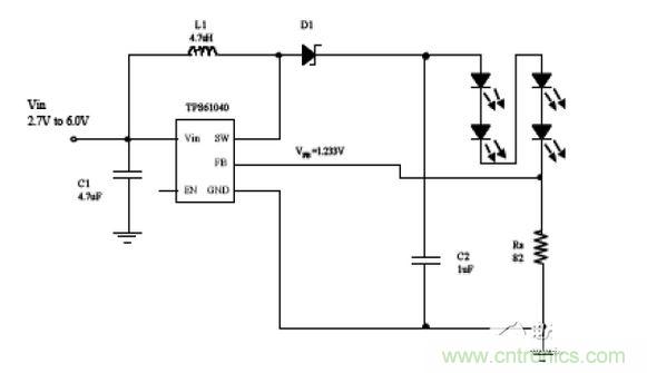 圖 中的升壓轉(zhuǎn)換器被配置為一個可驅(qū)動 4白光 LED 的電流源。該器件將檢測電阻器 Rs 兩端的電壓調(diào)節(jié)至 1.233V,從而得到一個定義的 LED 電流。