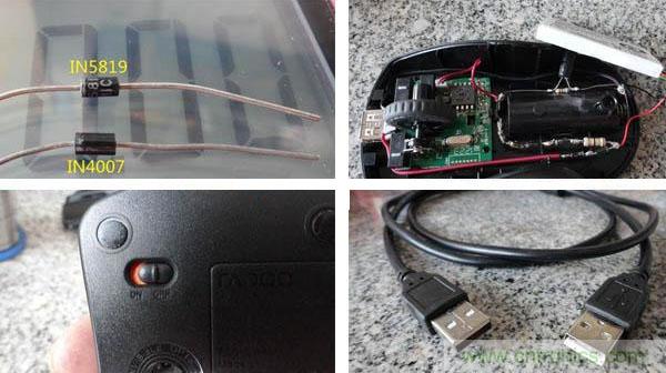 新加的鋰電正極通過15歐限流電阻和三個IN4007降壓,接到原電池正極,給鼠標(biāo)供電。