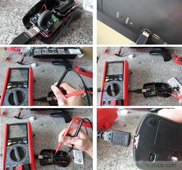 在測試的最后我們得到了一個比較合適的1.53V電壓,打開鼠標(biāo)電源開關(guān)后正常工作。1.53V電壓沒變。限流電阻兩端電壓0.34V /15歐=26.66MA。