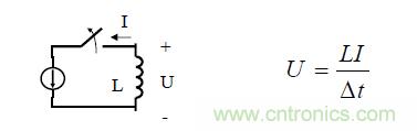 2. 當(dāng)一電感上的電流突然中斷, 在其兩端會產(chǎn)生一瞬時高壓, 并且電感量越大該電壓越高。
