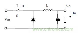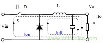 當(dāng)開關(guān)斷開時,由于電感上的電流不能突變,電感電流就通過二極管D續(xù)流,該二極管稱為續(xù)流二極管,這樣就實現(xiàn)了對原先流過開關(guān)管電流的續(xù)流,同時電感中存儲的一部份能量向負(fù)載釋放。續(xù)流電流環(huán)包括:二極管,電感,負(fù)載。在這階段流過電感上的電流用下式描述: