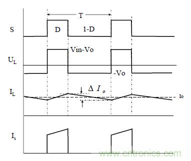 我們可以把BUCK電路的工作過程分成兩個階段,當(dāng)開關(guān)導(dǎo)通時,輸入電壓加到LC濾波器的輸入端,電感上的電流以固定斜率線性上升。電感上的電流用下面公式描述: