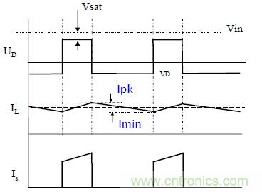 在這階段,電流波形是一條斜率為負(fù)的斜線,斜率為-Vout/Lo。當(dāng)開關(guān)再次導(dǎo)通時,二極管迅速關(guān)斷,電流從輸入電源和開關(guān)管流過。在開關(guān)導(dǎo)通前瞬間,電感上的電流Imin就是開關(guān)管通過的初始電流。