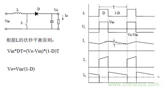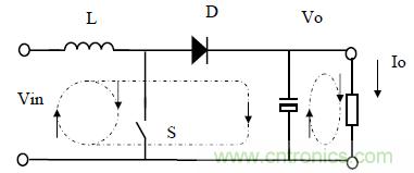 升壓變換器與BUCK變換器有著相同的組成部份,只是它們的位置被重新布置了一下。新的布局使變換器與正激式變換器的工作過程完全不同。在這種情況下,開關(guān)管導(dǎo)通時,電流環(huán)路僅在包括電感,開關(guān)管和輸入電壓源。在這段時間中,二極管是反向阻斷的。電感電流波形也是以固定斜率上升,可用下式描述: