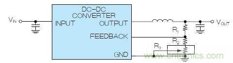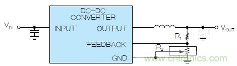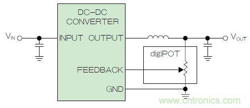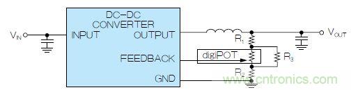 圖2. 使用數(shù)字電位計調(diào)整DC-DC轉(zhuǎn)換器輸出電壓,組成可變反饋電阻