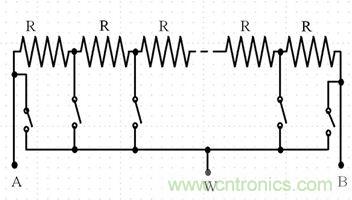 圖3:顯示電子開關(guān)的64位數(shù)字電位計。同一時間只能閉合一個電子開關(guān),該開關(guān)決定電阻比。