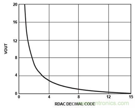 以RAW和RWB代替R1和R2可實現(xiàn)對數(shù)傳遞函數(shù)。數(shù)字碼和輸出電壓之間的非線性關(guān)系降低了低端分辨率。圖5顯示了這個取自數(shù)字電位計的對數(shù)傳遞函數(shù)。