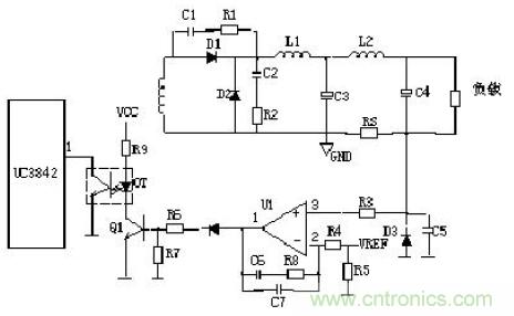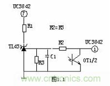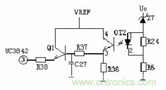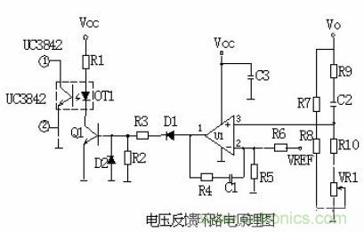 當(dāng)輸出U0升高,經(jīng)取樣電阻R7、R8、R10、VR1分壓后,U1③腳電壓升高,當(dāng)其超過U1②腳基準(zhǔn)電壓后U1①腳輸出高電平,使Q1導(dǎo)通,光耦OT1發(fā)光二極管發(fā)光,光電三極管導(dǎo)通,UC3842①腳電位相應(yīng)變低,從而改變U1⑥腳輸出占空比減小,U0降低。