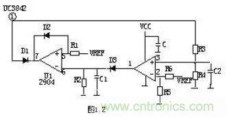 取樣電壓分為兩路,一路經(jīng)R1、R2、R3、R4分壓后輸入比較器3腳,如取樣電壓高于2腳基準(zhǔn)電壓,比較器1腳輸出高電平去控制主控制器使其關(guān)斷,電源無輸出。另一路經(jīng)R7、R8、R9、R10分壓后輸入比較器6腳,如取樣電壓低于5腳基準(zhǔn)電壓,比較器7腳輸出高電平去控制主控制器使其關(guān)斷,電源無輸出。