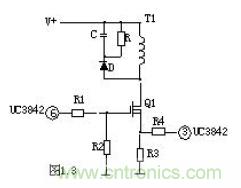 R4、C3、R5、R6、C4、D1、D2組成緩沖器,和開關(guān)MOS管并接,使開關(guān)管電壓應(yīng)力減少,EMI減少,不發(fā)生二次擊穿。在開關(guān)管Q1關(guān)斷時,變壓器的原邊線圈易產(chǎn)生尖峰電壓和尖峰電流,這些元件組合一起,能很好地吸收尖峰電壓和電流。從R3測得的電流峰值信號參與當(dāng)前工作周波的占空比控制,因此是當(dāng)前工作周波的電流限制。當(dāng)R5上的電壓達(dá)到1V時,UC3842停止工作,開關(guān)管Q1立即關(guān)斷。