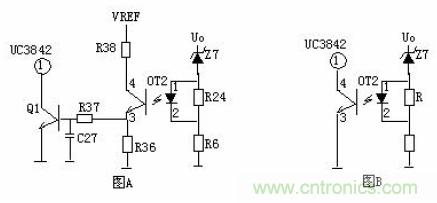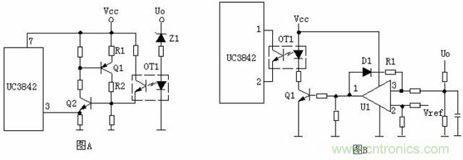 圖A的工作原理是,當(dāng)輸出電壓Uo升高,穩(wěn)壓管導(dǎo)通,光耦導(dǎo)通,Q2基極得電導(dǎo)通,由于Q2的導(dǎo)通Q1基極電壓降低也導(dǎo)通,Vcc電壓經(jīng)R1、Q1、R2使Q2始終導(dǎo)通,UC3842③腳始終是高電平而停止工作。在圖B中,UO升高U1③腳電壓升高,①腳輸出高電平,由于D1、R1的存在,U1①腳始終輸出高電平Q1始終導(dǎo)通,UC3842①腳始終是低電平而停止工作。正反饋?