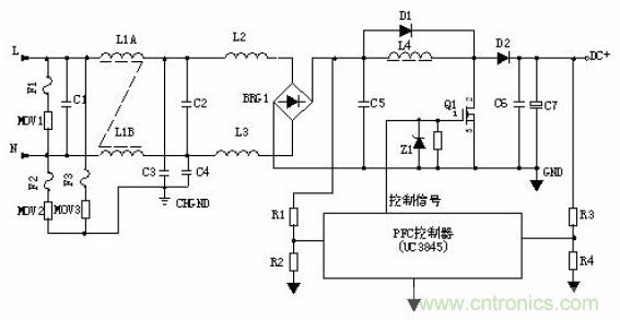 輸入電壓經(jīng)L1、L2、L3等組成的EMI濾波器,BRG1整流一路送PFC電感,另一路經(jīng)R1、R2分壓后送入PFC控制器作為輸入電壓的取樣,用以調(diào)整控制信號的占空比,即改變Q1的導(dǎo)通和關(guān)斷時間,穩(wěn)定PFC輸出電壓。L4是PFC電感,它在Q1導(dǎo)通時儲存能量,在