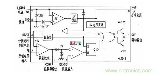 ⑥輸出端驅(qū)動能力是±1A。啟動電源端,啟動電壓低于16V,KA3842不工作