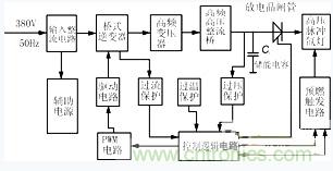 本文介紹的激光電源為工作于重復脈沖方式的固體激光器提供電能。該激光器采用氙燈作泵浦光源,在惰性氣體燈中,氙氣的總轉換效率最高。激光器用于激光打標,工作頻率每秒60次。電源系統采用IGBT管全橋逆變方式,工作頻率為20kHz,控制電路采用PWM方式。