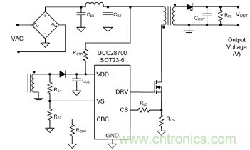 UCC28700是一款恒壓、恒流反激式控制器,無(wú)需使用光耦合器便可實(shí)現(xiàn)一次側(cè)穩(wěn)壓。圖1是UCC28700的應(yīng)用電路。