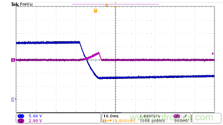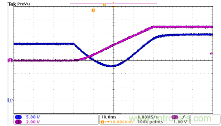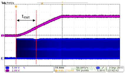 圖4是UCC28700的啟動(dòng)波形,CH1是MOSFET柵極驅(qū)動(dòng)信號(hào),CH3是輸出電壓。該器件啟動(dòng)順暢,沒有過(guò)沖和聲頻噪聲。該圖顯示,UCC28700器件有非常好的啟動(dòng)性能。在圖4中,tstart接近18ms,與計(jì)算結(jié)果吻合。