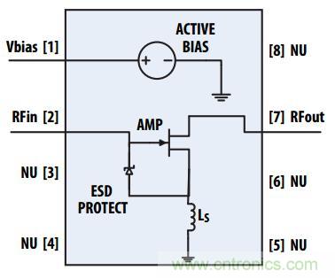 圖:MMIC本身由一個單個的FET共源放大器和一個動態(tài)偏壓調(diào)制器組成