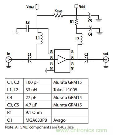 可調(diào)節(jié)的偏壓特性使得工程師在使用器件時需要在功耗和線性度上做取舍。在不需要高線性度的應用中,工程師可以通過增加Rbias(正常為6.8k歐姆)的電 阻來達到省電的目的。或者在增益和輸出功率變化不大(ΔG和ΔP1dB≤0.5dB)的情況下,通過改變Idd的電流(25~75mA),使得低噪放的 OIP3產(chǎn)生大約10dB的變化。這使得具有微控制器控制Vbias的低噪放對頻譜擁擠的自適應能力大大增強。