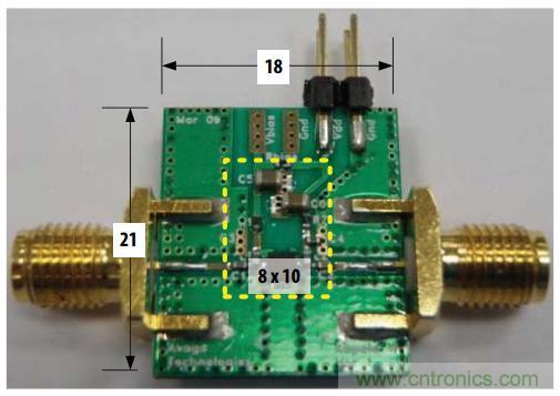 圖中PCB的尺寸為21.5×18×1.4mm,PCB板材有兩層,頂層為Rogers的RO4350,厚度為10mil,底層為低成本的FR4,厚度為 1.2mm,二者的接地銅箔緊緊的結(jié)合在一起。射頻連接器是Johnson的SMA接頭,DC電源接頭是2-pin的連接器,被動元件的尺寸都是0402 的,這樣整個元器件區(qū)域的大小約為8×10mm2。