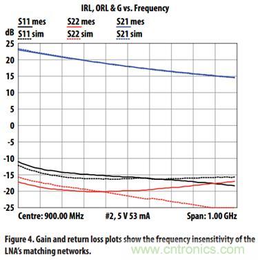 在900MHz,低噪放的噪聲大約為0.3dB,增益大約為18dB,輸入和輸出回波損耗為小于-15dB。另外,在1GHz的帶寬內(nèi),回波損耗都可以滿足 這個要求。從系統(tǒng)的角度來說,這個是非常受歡迎的特性。主要是由于傳統(tǒng)的基站需要靠隔離器或者3dB耦合器來滿足系統(tǒng)回波損耗的要求。進一步來說,輸入輸 出匹配的寬帶寬也使得基站的雙工器或者輸入輸出濾波器的使用調(diào)試變得簡單,降低了系統(tǒng)的設計復雜度。