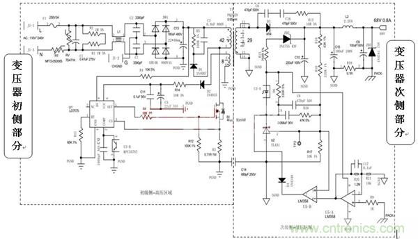 圖2是反激式開(kāi)關(guān)電源的原理圖,就是在圖1框圖的基礎(chǔ)上,對(duì)各個(gè)部分進(jìn)行詳細(xì)的設(shè)計(jì),當(dāng)然,這些設(shè)計(jì)都是按照一定步驟進(jìn)行的。下面會(huì)根據(jù)這個(gè)原理圖進(jìn)行各個(gè)部分的設(shè)計(jì)說(shuō)明。