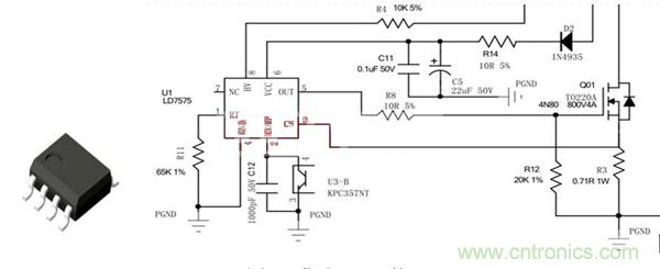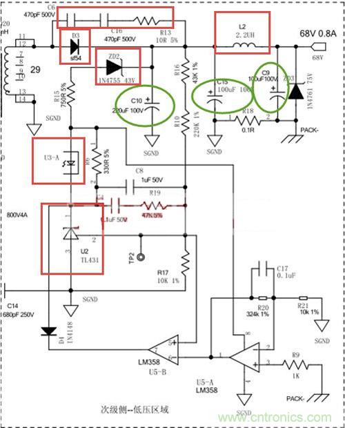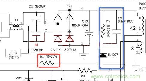 紅線圈起的電阻為I C的高壓?jiǎn)?dòng)電阻,電阻阻值的選擇由IC特性決定。