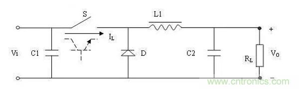 開關電源就是采用功率半導體器件作為開關元件,通過周期性通斷開關,控制開關元件的占空比來調整輸出電壓。開關元件以一定的時間間隔重復地接通和斷開,在開關無件接通時輸入電源Vi通過開關S和濾波電路向負載RL提供能量,當開關S斷開時,電路中的儲能裝置(L1、C2、二極管D組成的電路)向負載RL釋放在開關接通時所儲存的能量,使負載得到連續(xù)而穩(wěn)定的能量。